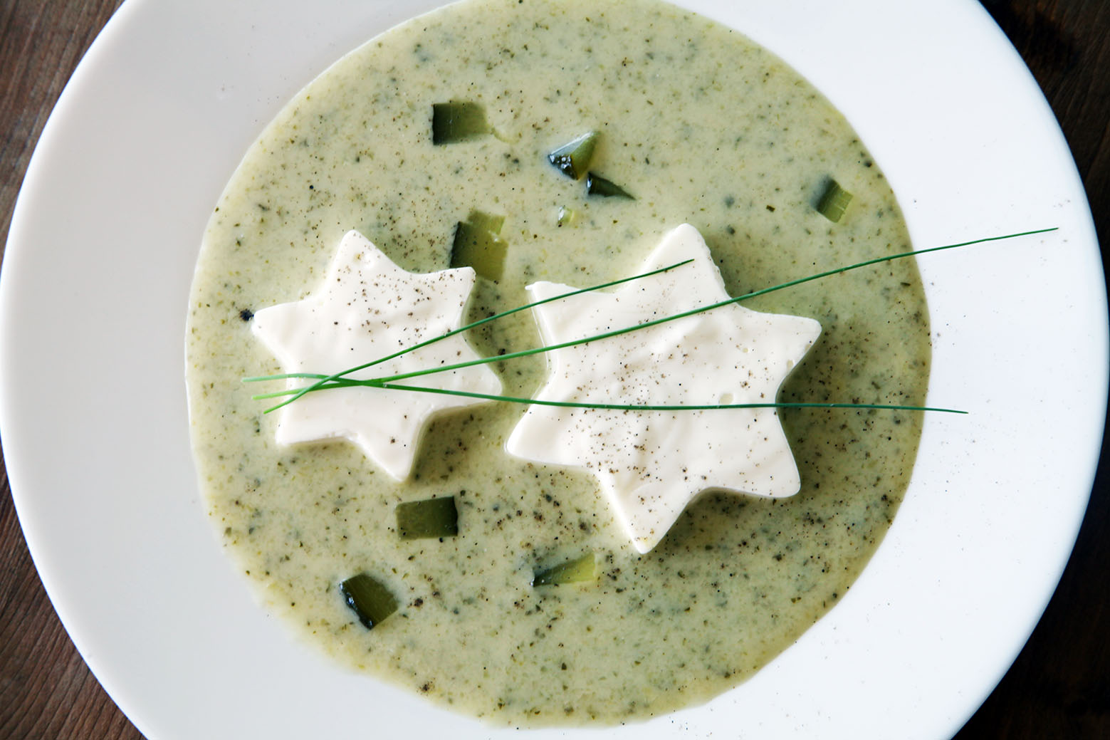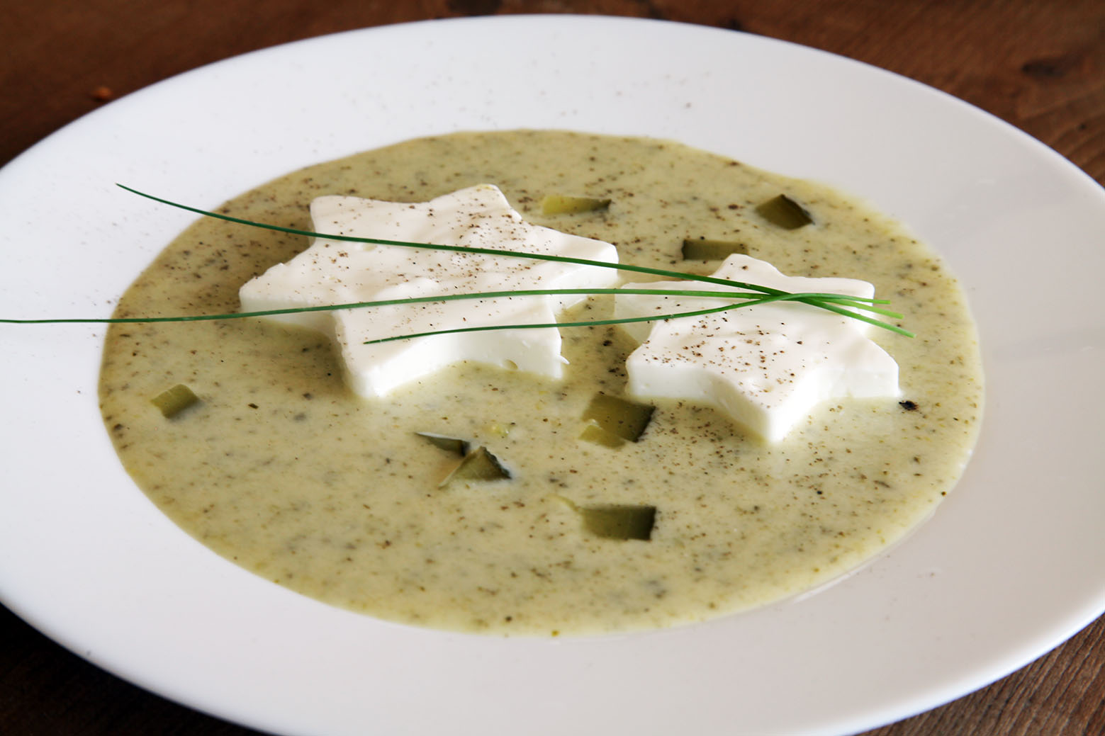 A kovászos uborka krémlevest nem biztos, hogy mindenki szereti, de próbáljátok ki, mert jólesően savanykásan pikáns ízét, a kocsonyázott joghurt kicsikét édeskés íze ellensúlyozza.