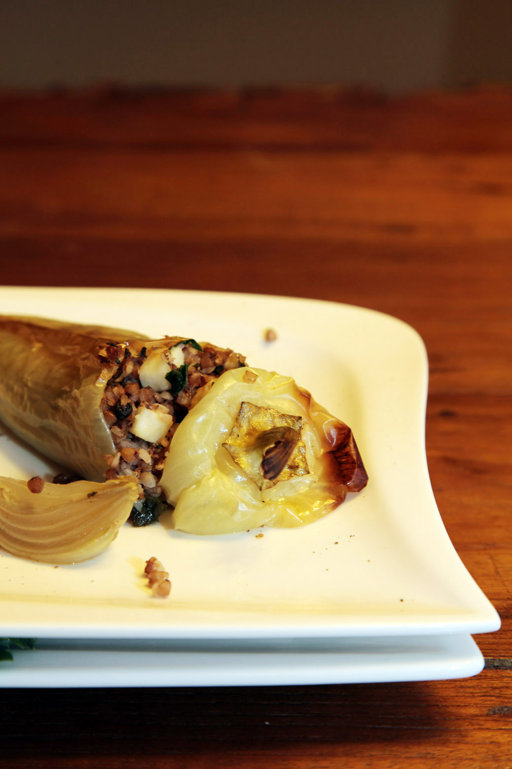 A réteslapoknak bevizezek egy konyharuhát, olajozom, és zsemlemorzsával megszórom mindegyiket, a legfelsőre vastagabban teszem a morzsát, hogy felszívja a kisülő leveket. Beborítom káposzta levéllel, ráhalmozom a husit, feltekerem. Olajos tejföllel megkenem.