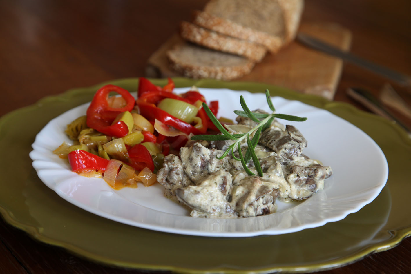 A vajon megfuttatom a durva csíkokra vágott hagymát, rádobom a megtisztított májat, megszórom csomborral, és nagy lángon, kevergetve pirítom, majd fél deci vízzel felengedem, lefedem, és kis lángon főzöm, míg zsírjára vissza nem sül, ekkor belekeverem a mascarponét, mellé teszem a rozmaring ágakat, és kevergetve összeolvasztom a sajttal.