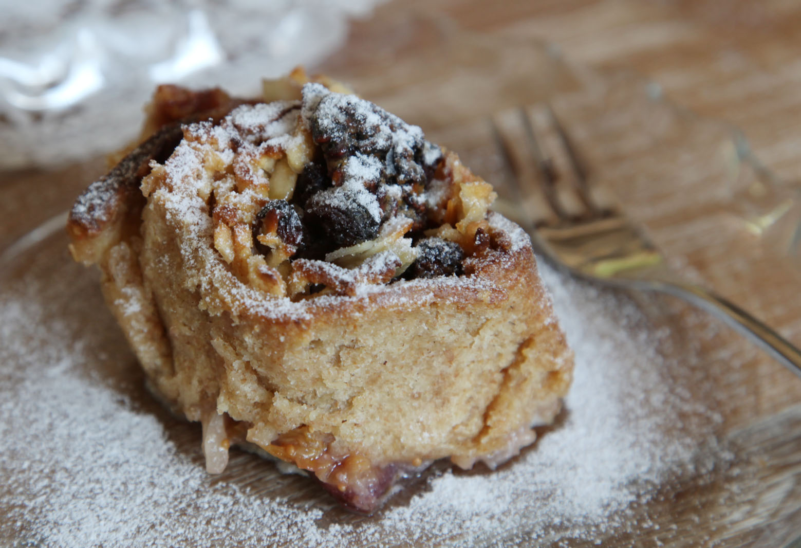A liszteket összekeverem, kb 3 evőkanálnyit félre teszek a nyújtáshoz, a többihez hozzá adom a sütőport. A túrót elkeverem a tejjel, olajjal, mézzel, citromhéjjal. Gyúródeszkán összedagasztom a lisztkeveréket a túrós masszával. Kb 3 mm vastag téglalapot nyújtok belőle. A vajat megolvasztom, és a kinyújtott tésztát megkenem vele. Megszórom fahéjjal. Az almákat meghámozom, durvára gyalulom, ráteszem a tésztára. A fügéket összekockázom, egyenletesen elosztom az almán. Megszórom a mandulával, a mazsolával. Szorosan feltekerem. 10 egyforma részre vágom.