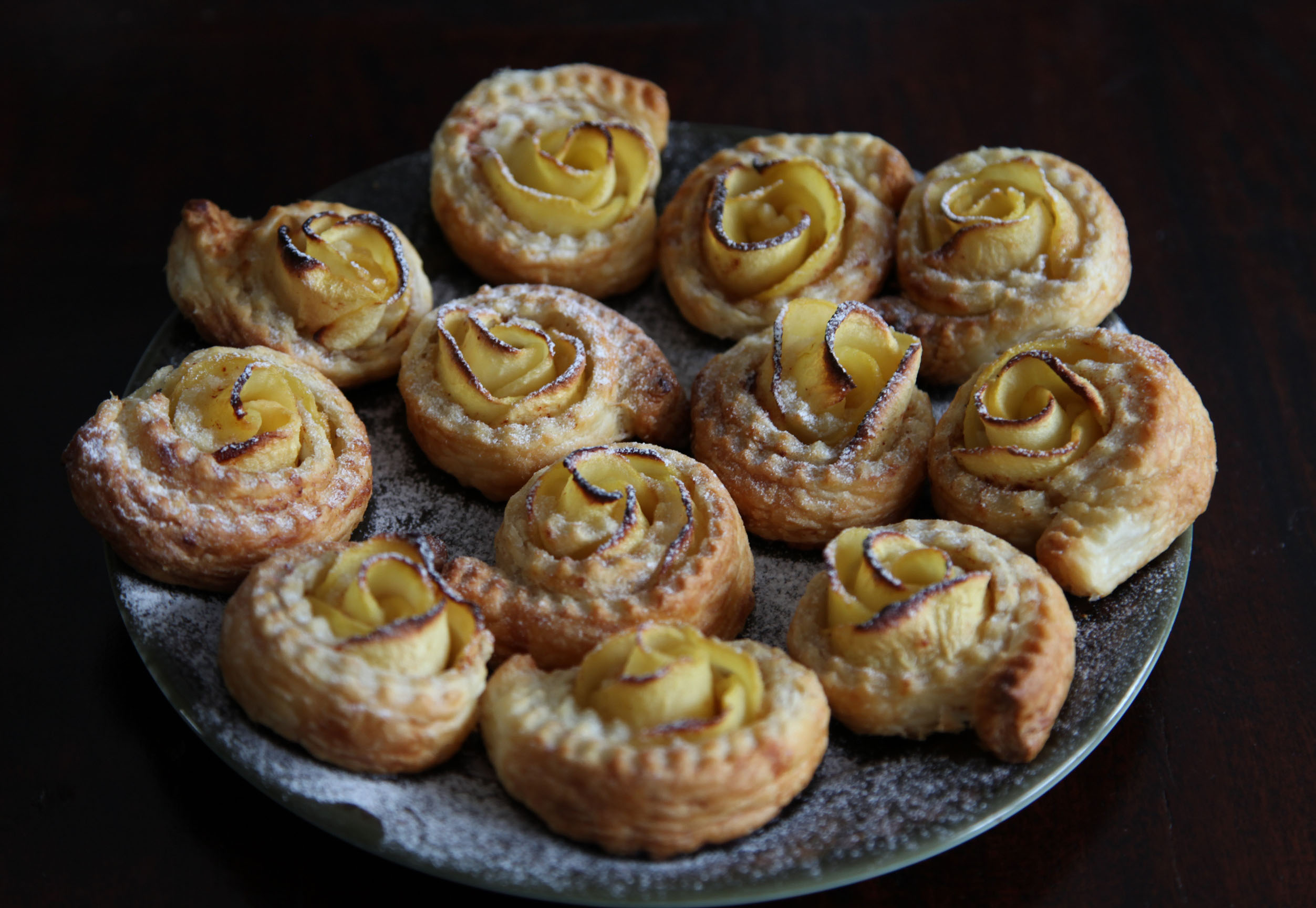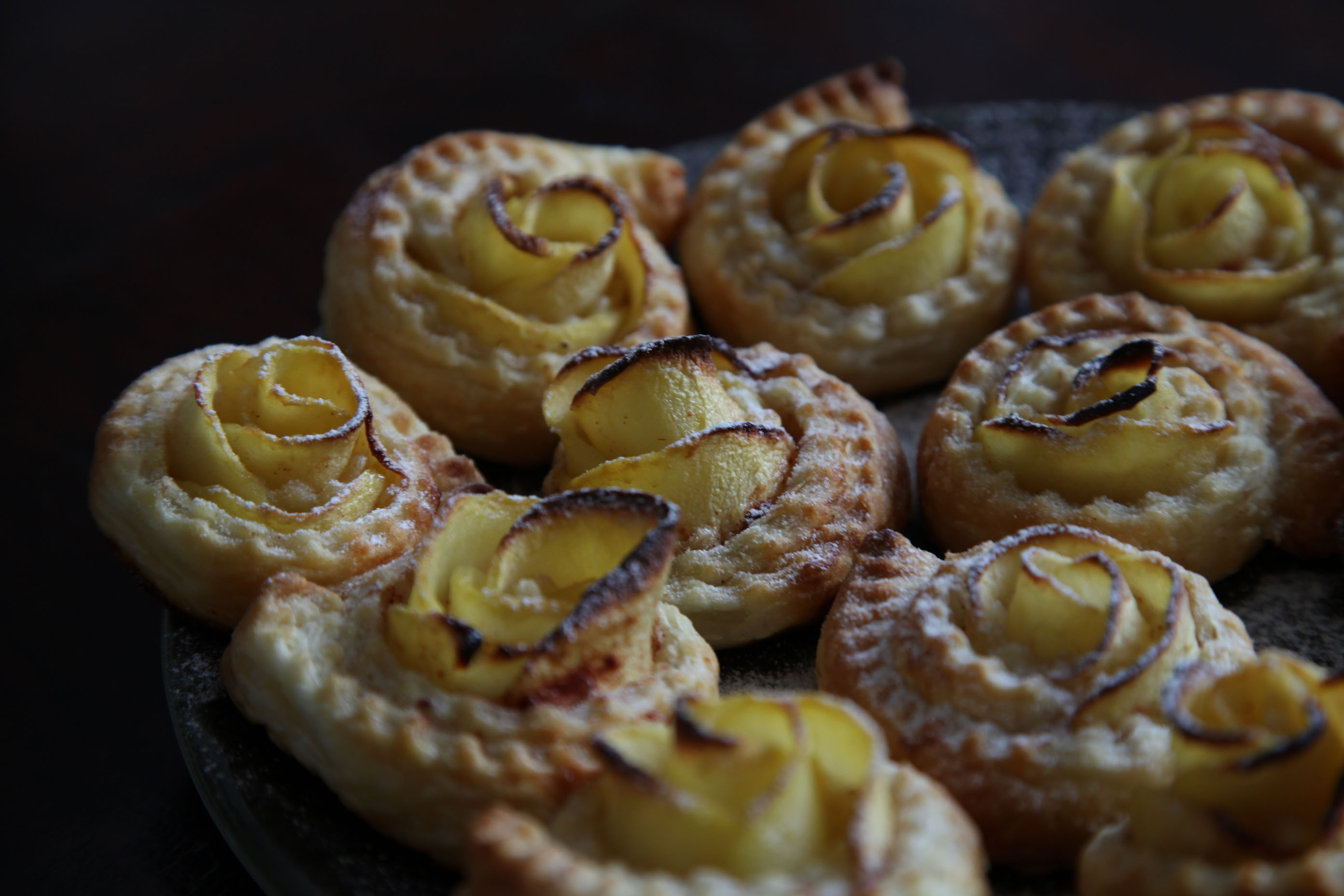 Az alma szirmokat fedésben a tészta csíkokra fektetem, majd feltekerem mindegyiket, és egy sütőpapírral kibélelt tepsibe teszem. (Olvasztott vajjal meglocsolom-elhagyható.)