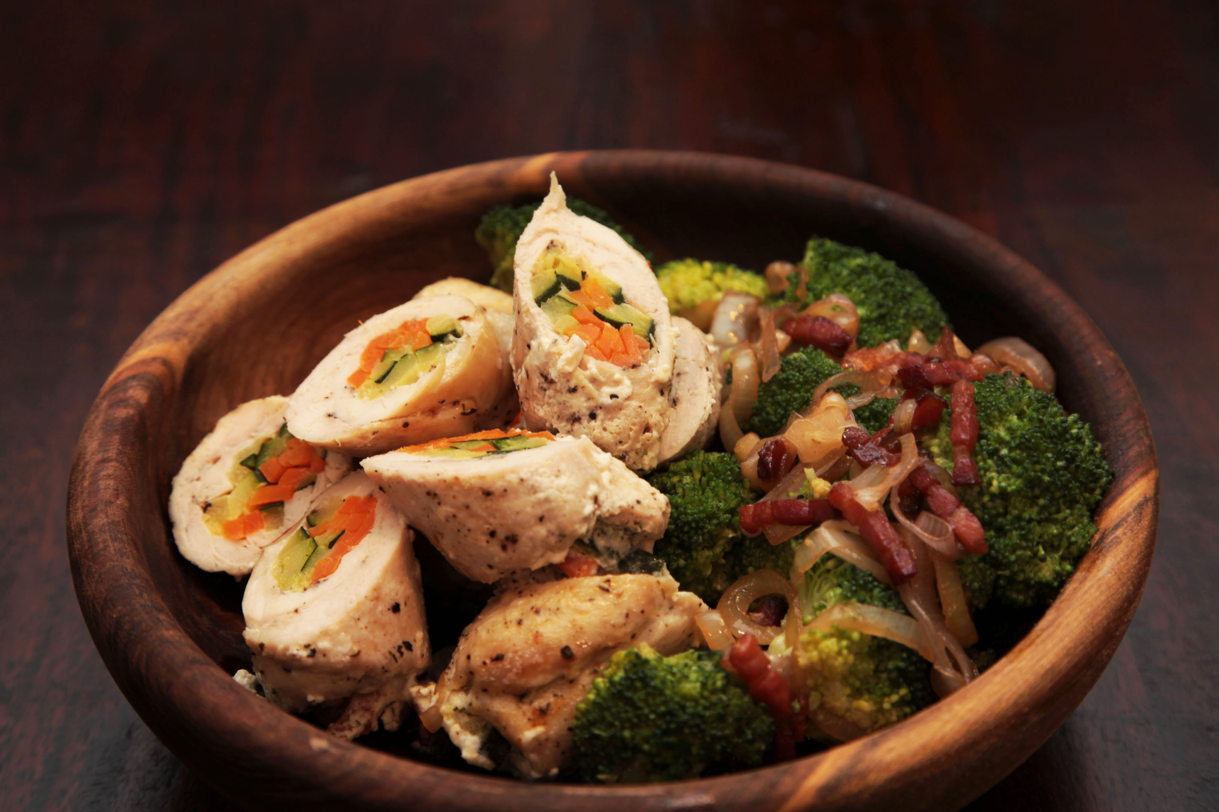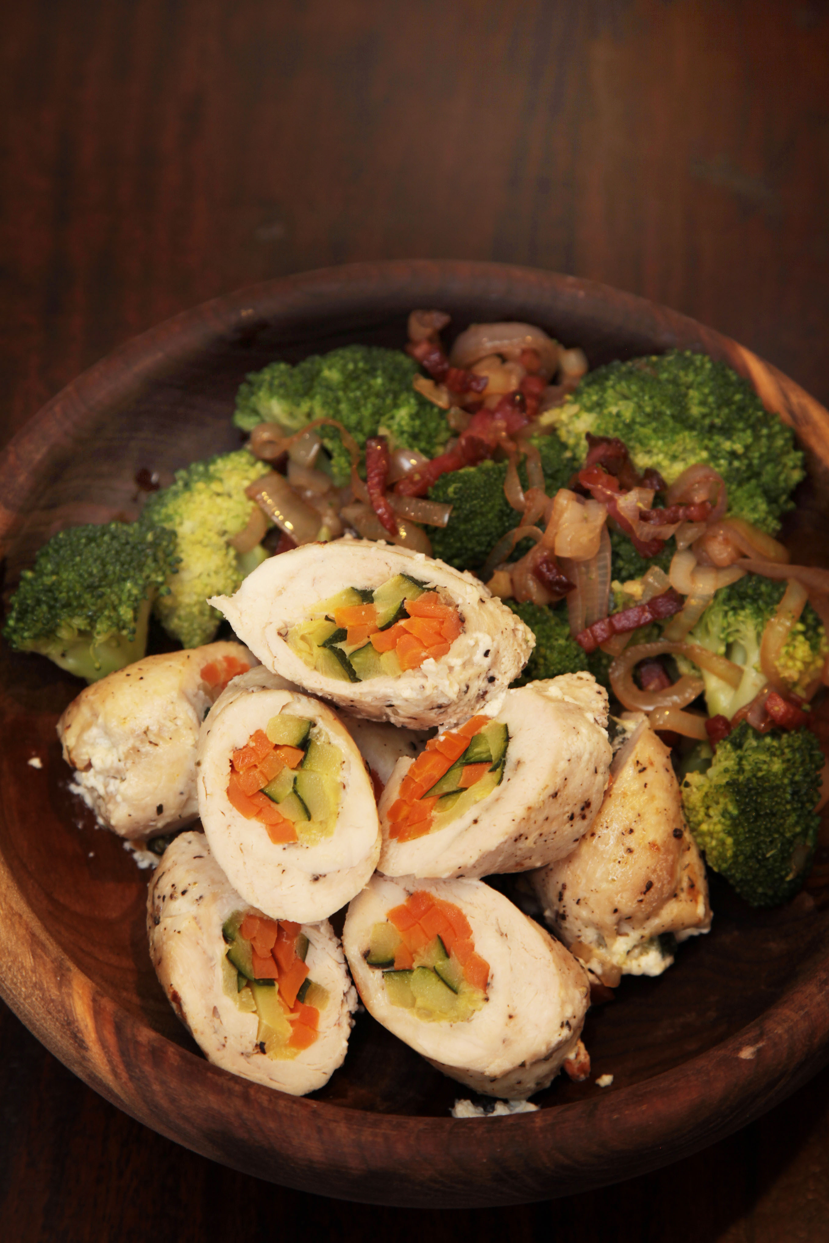 A csirkeszeletekre fektettem vegyesen a répát és a cukkinit, feltekertem, majd fóliába csomagoltam mindegyiket külön-külön.
