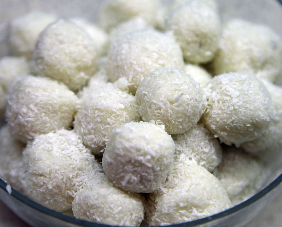 Felolvasztom vízgőz felett a csoki 2/3-át a sűrített tejben. Hozzá adom az apróra vágott mandulát, összekeverem, és hagyom kihűlni. A masszából vizes kézzel golyókat formázok, majd beleforgatom a tört ostyába és fél órára beteszem a hűtőbe. Felolvasztom a maradék csokit, beleforgatom a golyókat és hagyom, hogy rádermedjen. Végül meghempergetem a kókuszreszelékben.