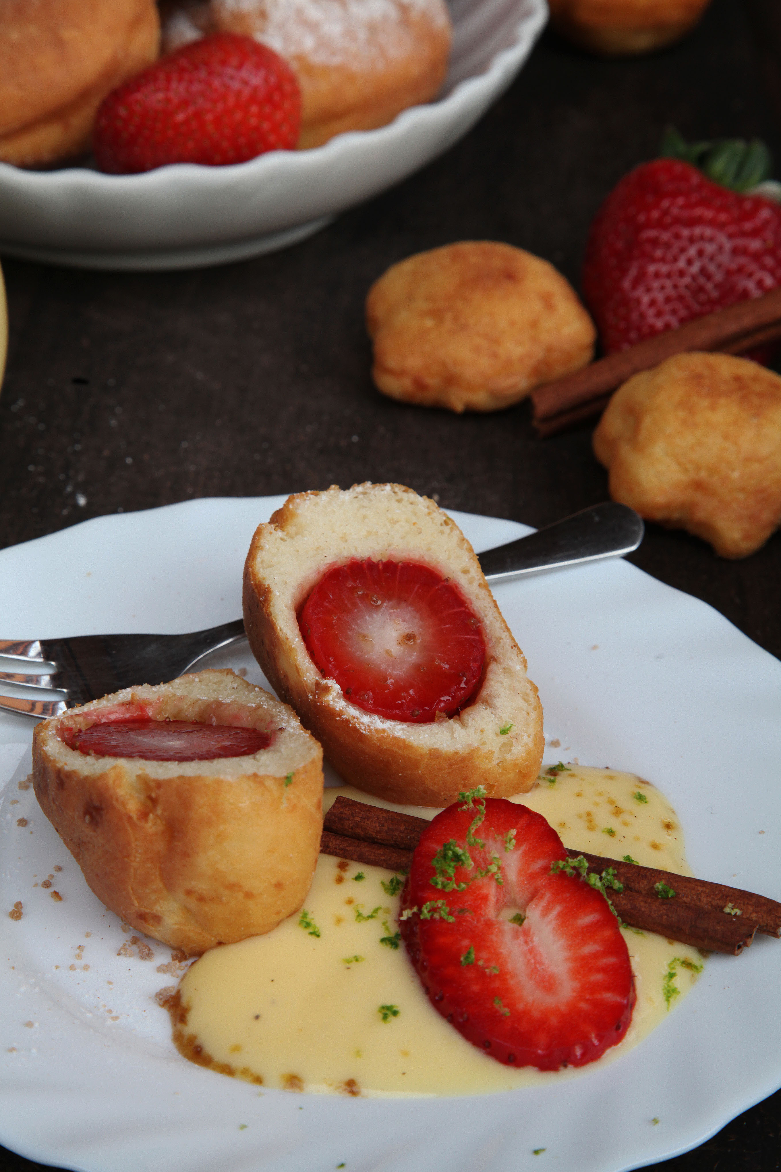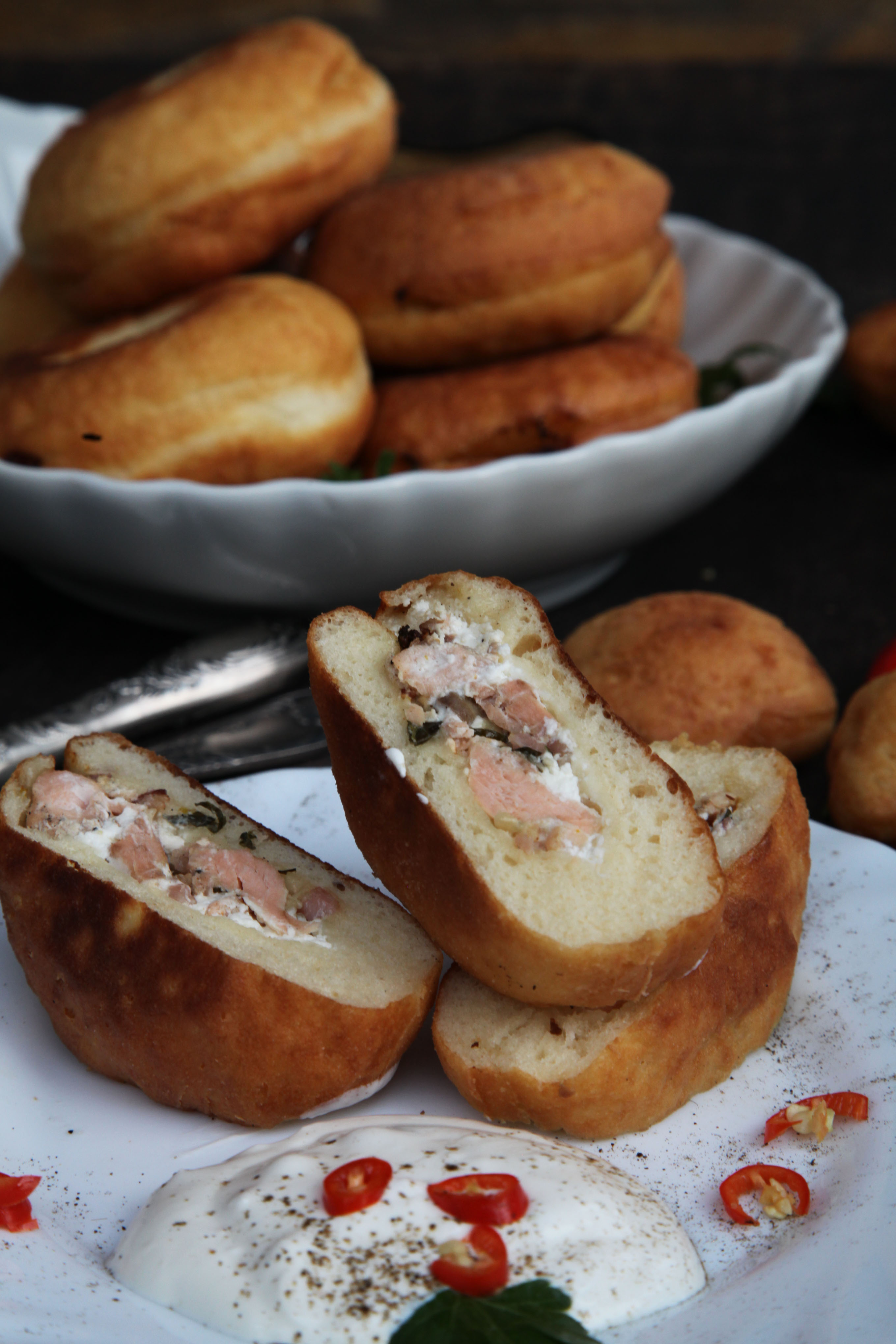 Még sosem sütöttem fánkot. Valahogy ez kimaradt. Talán azért, mert így farsang idején Anyu mindig sütött a gyerekeimnek. Tegnap mégis ihletet kaptam, hogy nekilássak, de semmiképpen nem szerettem volna a hagyományos változatot megsütni. Miért ne lehetne lekvár helyett gyümölccsel tölteni? Boginál -zöldséges- csodás friss eprek kellették magukat a pulton, gyönyörű chilikkel és lime-okkal egyetemben. Már válogatás közben  kezdett kialakulni bennem a kép egy rákkal töltött variációra is. De rákot sajnos nem kaptam, így kitaláltam, hogy lazacos lesz a sós változat.