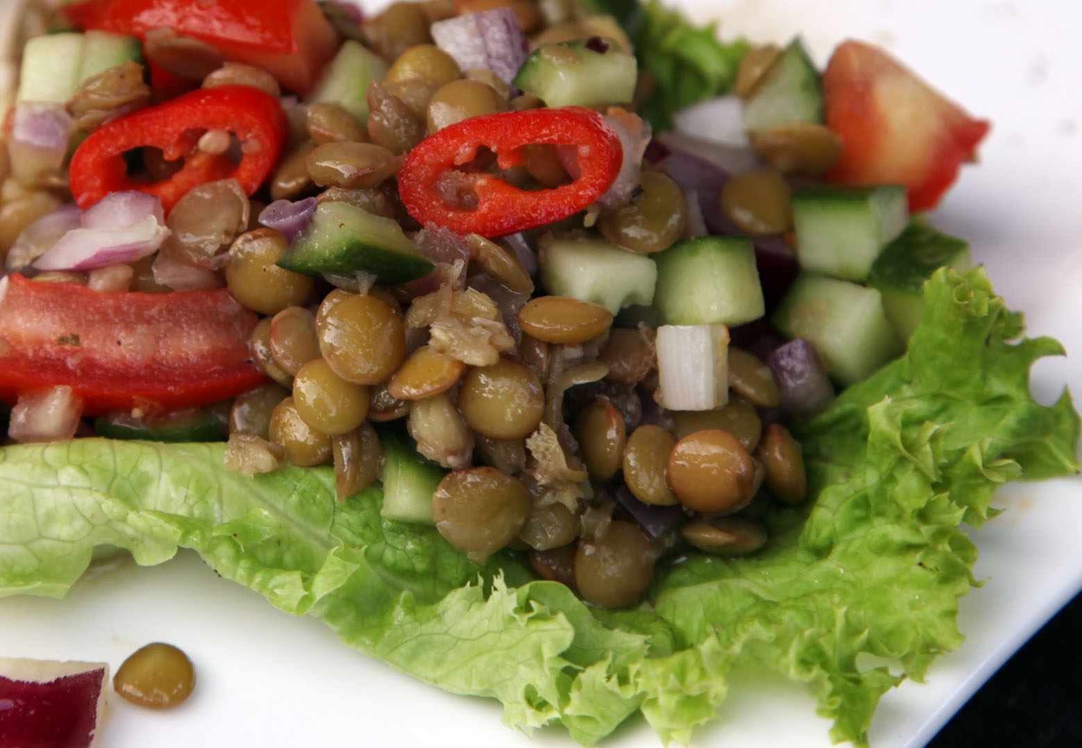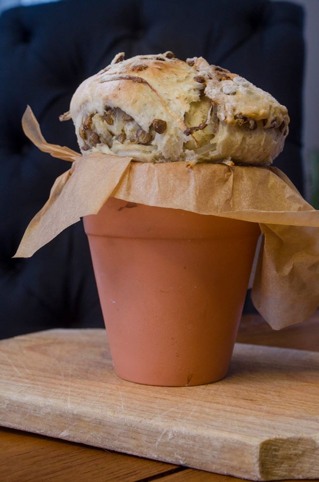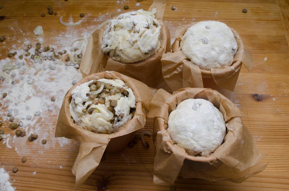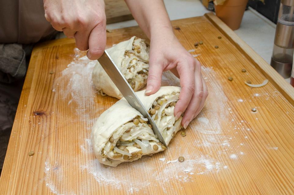A lisztet mély tábla szitáljuk, rászórjuk az élesztőt, sózzuk, ráöntjük az olajat, majd a vízzel kenyértészta keménységű tésztává dagasztjuk. Egy órát kelesztjük. A cserepeket kibéleljük sütőpapírral. A lencsét sós vízben puhára főzzük. A hagymát fél karikára vágjuk, és kevés zsiradékon kicsit megpároljuk. Sózzuk. A megkelt tésztát lisztezett deszkákra borítjuk, sodrófával kinyújtjuk kb. kétujjnyira. Egyenletesen eloszlatjuk rajta a hagymát és a lencsét is, majd mint a pogácsánál hajtogatjuk. 15 percig hagyjuk nyugodni. Ezután óvatosan átgyúrjuk, cipót formázunk belőle, majd négybe vágjuk. Mindegyikből kis bucit formázunk, és beletesszük egyenként egy-egy cserépbe.