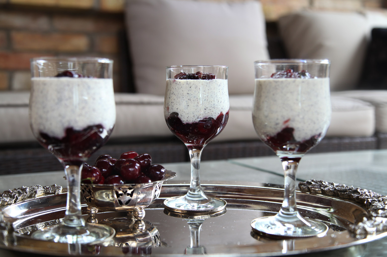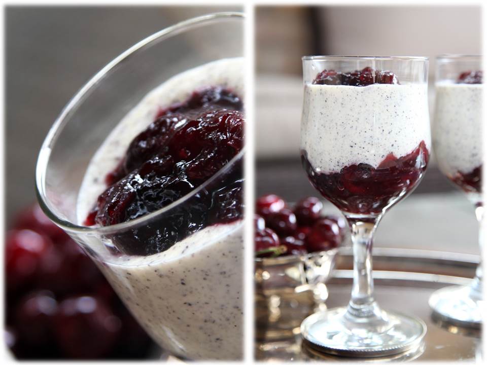A mákot száraz serpenyőben megpirítottam. A tejbegrízt a hozzávalókkal folyamatosan keverve megfőztem, majd levettem a tűzről, 5 perc múlva belekevertem a tojás sárgáját, végül a lime reszelt héját, és pár cseppet a levéből. Mikor teljesen kihűlt, simára kevertem a doboz mascarpone-val. A cseresznyét, aszalt szilvát a cukorral felforraltam, hozzá adtam a lime levét, a cherryt, sűrűre főztem. A legvégén kevertem hozzá a málnaszemeket. Kihűtöttem. Poharakba kanalaztam rétegesen.