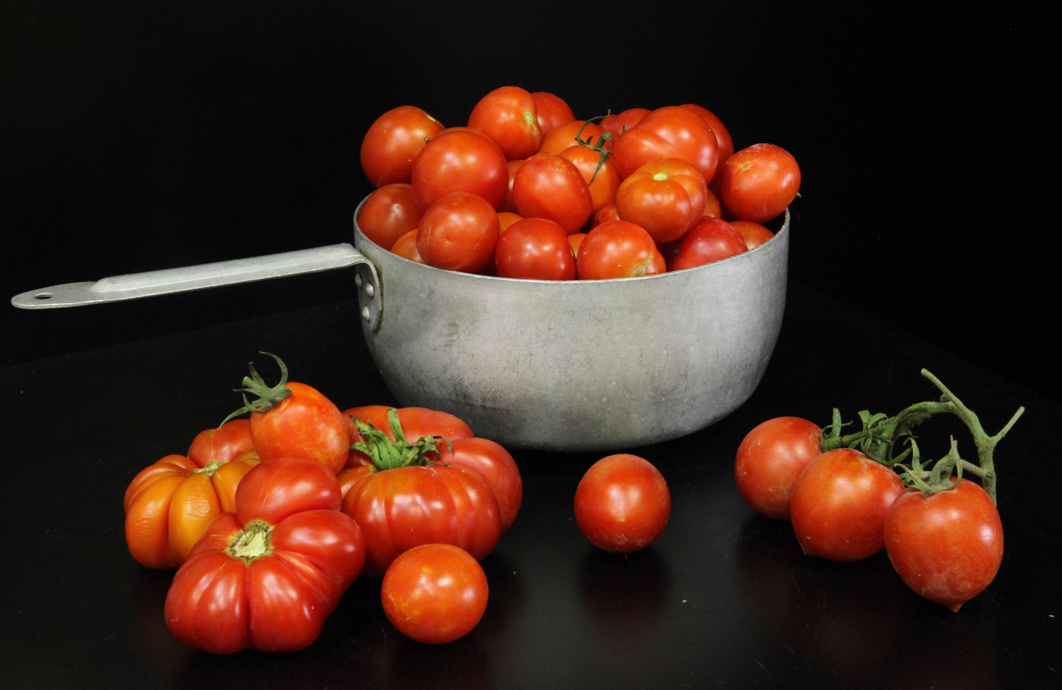 A paradicsomoknak lehúztam a héját, ketté vágtam, és a fokhagymás olajba tettem. Pirítottam. Egy marék csíkozott bazsalikomot dobtam rá, sóztam, tettem bele cayenne borsot.