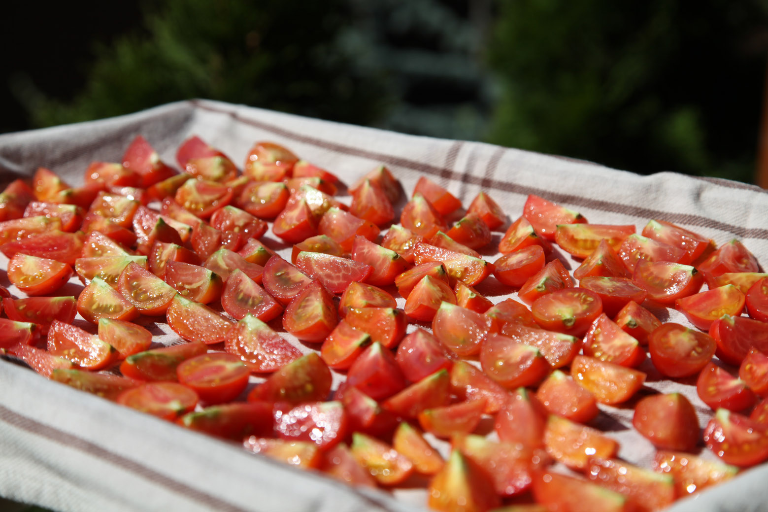 Ezen a nyáron ez lesz a harmadik adag, amit ma kezdtem szárítani. A hiedelmekkel ellentétben, nem csak a lucullus paradicsom alkalmas rá, hanem mindegyik. Csak trükközni kell kicsit. A nagyobbaknak el kell távolítani a magházát, vagy nem négybe, hanem nyolcba vágni. A fürtös paradicsom, és a koktél paradicsom egy hét alatt kiszárad. A többinek lehet, kettő hétre van szükségük. A lényeg, mossad meg, vágd ketté, négybe, hatba, nyolcba…. Alaposan sózzad meg, tedd konyharuhával borított tálcára, és már mehet is napozni. Este be kell vinni. Aztán reggel megint ki a napra. Ha támadják a muslicák, letakarom tüllel.