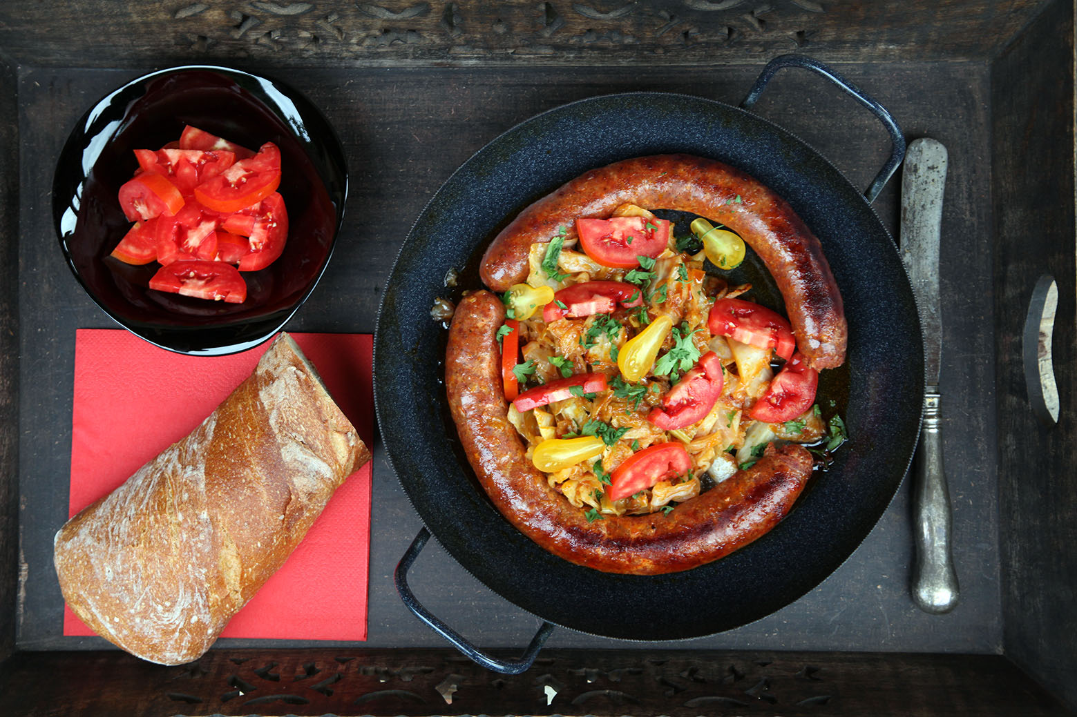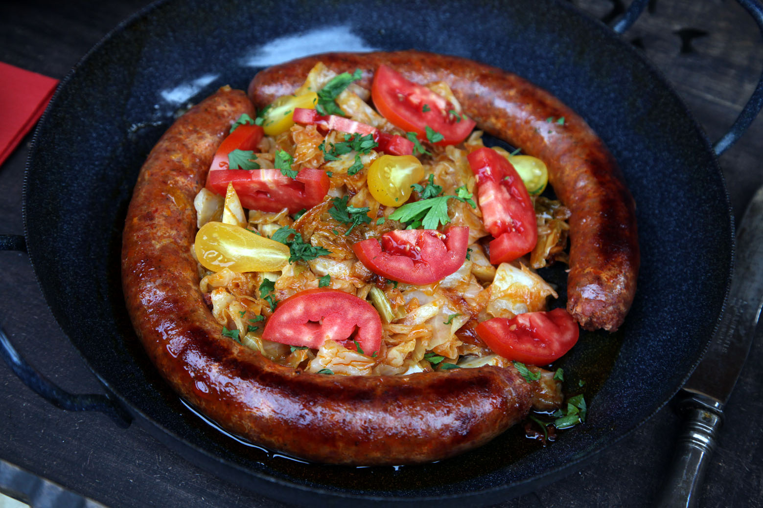 Ma a piacon nem csak a kovászolni való káposztát vettem meg, hanem – sok minden mellett -, egy pár sütni való kolbászt is. Csak azért teszem fel ide a blogra, mert bevált szokás, simán krumplival megsütni. Én pedig szeretek játszadozni a konyhában, s így lett ez a káposzta maradékkal összesütött kolbász. Ami paradicsommal (paprikával, hagymával), friss kenyérrel, éppen egy ilyen borongós időjárású estéhez illő, íncsiklandozó vacsora. Egy jégbe hűtött sör…, lassan búcsúztathatjuk a teraszon eltöltött estéket…