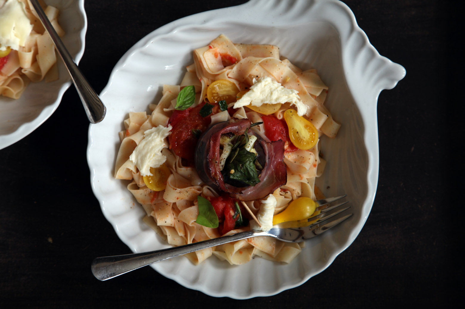 Leszűrtem a tésztát, beleborítottam a paradicsomba. Összekevertem.