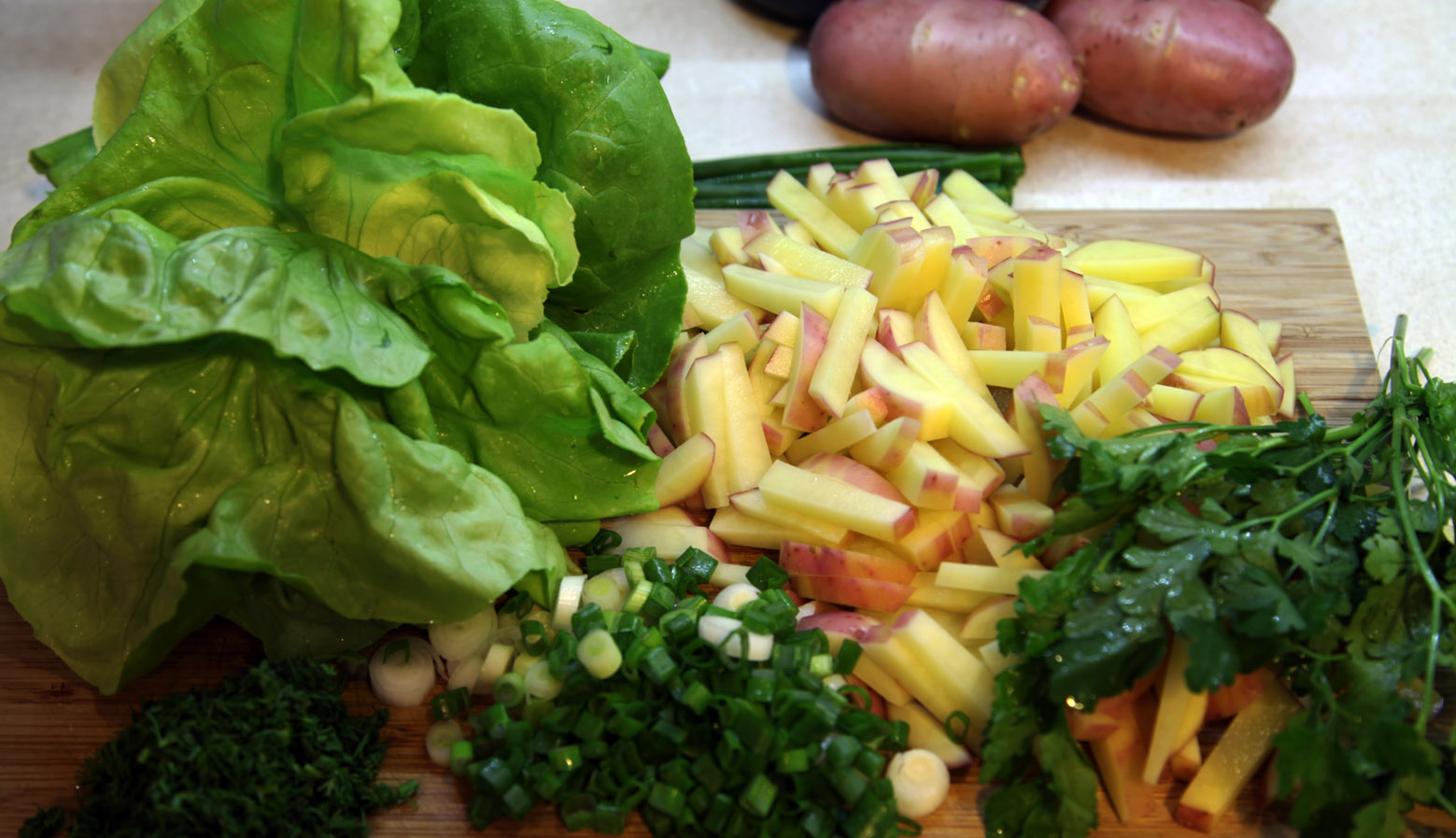 Az újkrumplit héját ledörzsöltem, összevágtam. Az olajon megpirítottam 4 gerezd kinyomott fokhagymát. Hozzáadtam a krumplit, kevergetve pároltam, majd megszórtam kevés liszttel, leöntöttem a borral, és tovább pirítottam. Felengedtem vízzel, adtam hozzá babérlevelet, sóztam, borsoztam, majd lassú tűzön megfőztem. Kidobtam a babérleveleket. Összeturmixoltam, adtam hozzá tejszínt, majd újra felforraltam.
